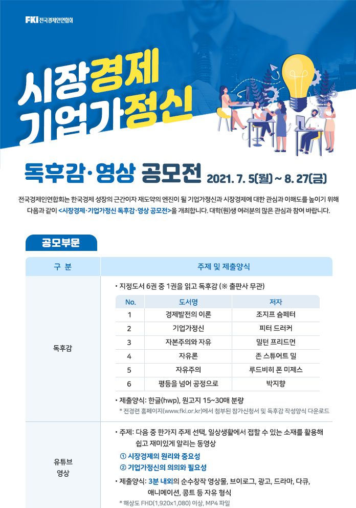 전국경제인연합회는 한국경제 성장의 근간이자 재도약의 엔진이 될 기업가정신과 시장경제에 대한 관심과 이해도를 높이기 위해 다음과 같이 <시장경제·기업가정신 독후감·영상 공모전>을 개최합니다. 대학(원)생 여러분의 많은 관심과 참여 바랍니다.