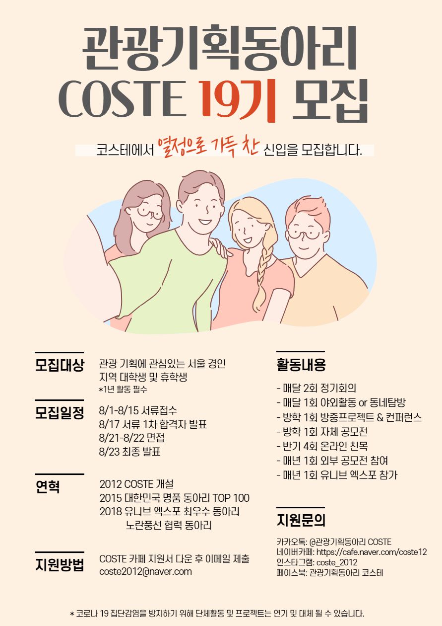 ✨국내유일✨ 관광기획동아리 COSTE에서 19기 코스티앙을 모집합니다!(~8/15)