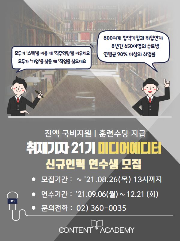 취재기자 20기 미디어에디터 신규인력 연수생 모집 한국잡지교육원에서는 언론 분야 취업을 준비하는 취업 준비생의 취업을 지원하기 위해 2021년도 “취재기자” 신규인력 양성과정 연수생을 모집합니다. 취재기자 20기 미디어에디터과정은 ‘20년도 600여개 교육협약기업의 채용 수요와 교육요구사항을 반영하여 교육내용을 개편·보완하였습니다. 한국잡지교육원 교육과정은 급변하고 있는 디지털 미디어 환경에 대처하기 위해 항상 새로워 지고 있습니다.