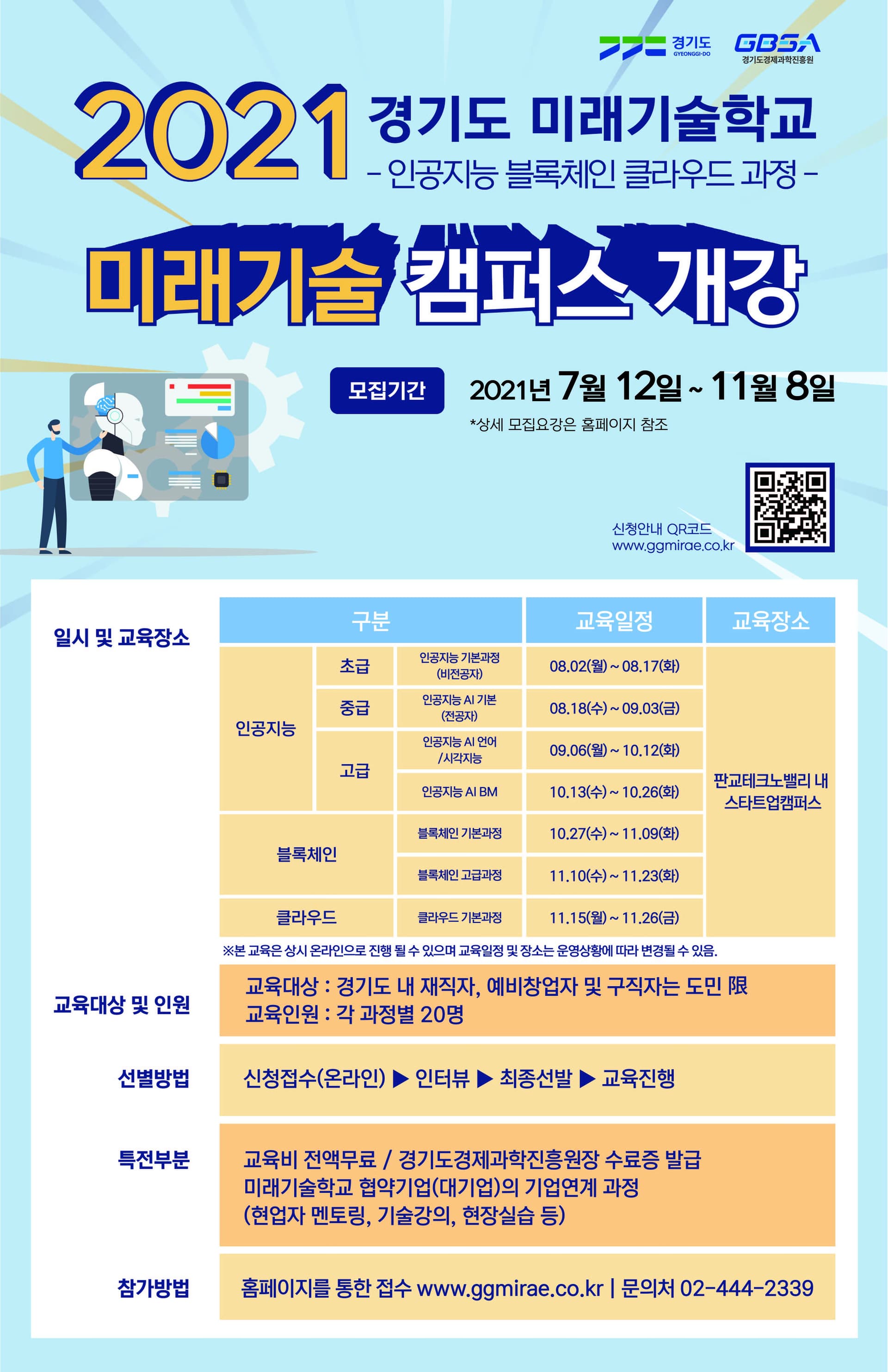 - 교육지원 : 교육비 전액무료, 경기도경제과학진흥원장 수료증 발급, 미래기술학교 협약기업(대기업)의 기업연계 과정(현업자 멘토링, 기술강의, 현장실습 등)