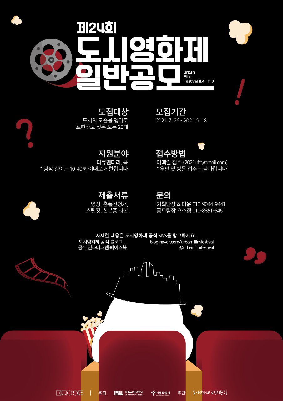2021년 11월 04일 부터 11월 06일까지 서울시립대학교에서 개최되는 제24회 도시영화제를 빛낼 영상을 출품해주실 지원자 분들을 모집합니다!🐳