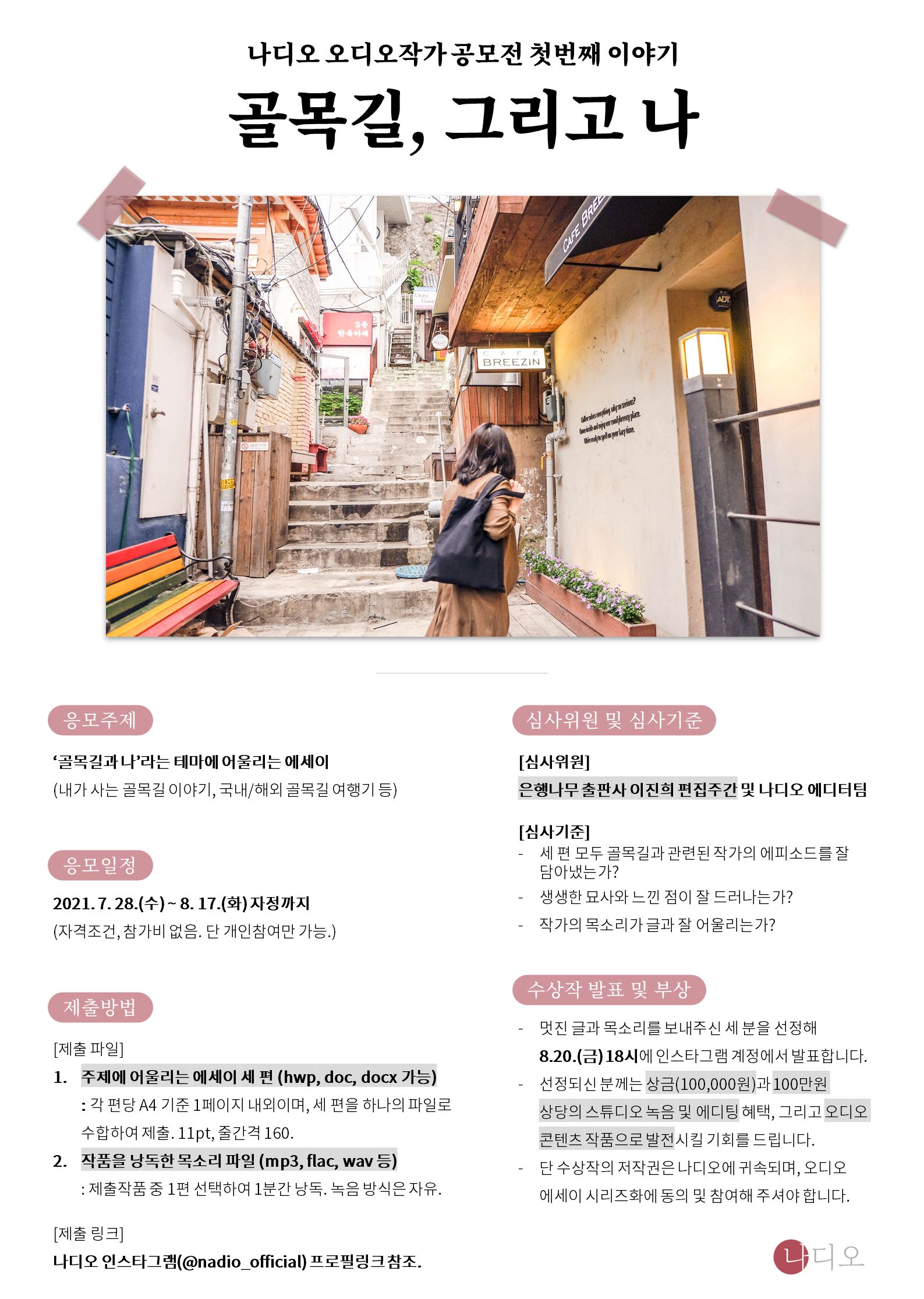 힐링 오디오 에세이 플랫폼 나디오에서 <골목길, 그리고 나> 공모전을 개최합니다.