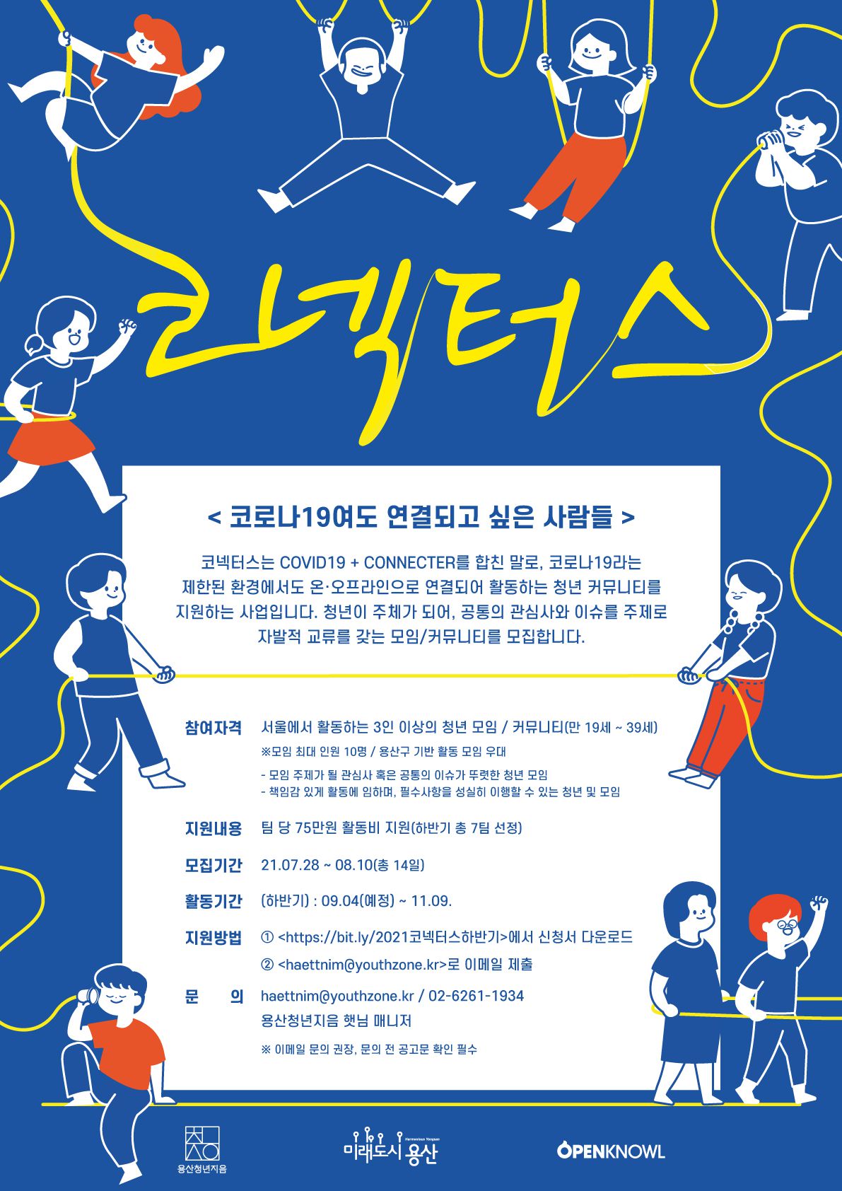 <코넥터스>는 코로나19란 제한된 환경에서도 온•오프라인으로 사람들과 지속적으로 연결되어 활동하는 청년 모임과 커뮤니티를 지원하는 지음의 청년교류형성지원 사업입니다. 하고 싶은 활동, 만들고 싶은 프로젝트를 짧고 굵게 하고 싶다! 면 올해 마지막 지원사업 <코넥터스> 하반기 모집에 참여해보세요👍