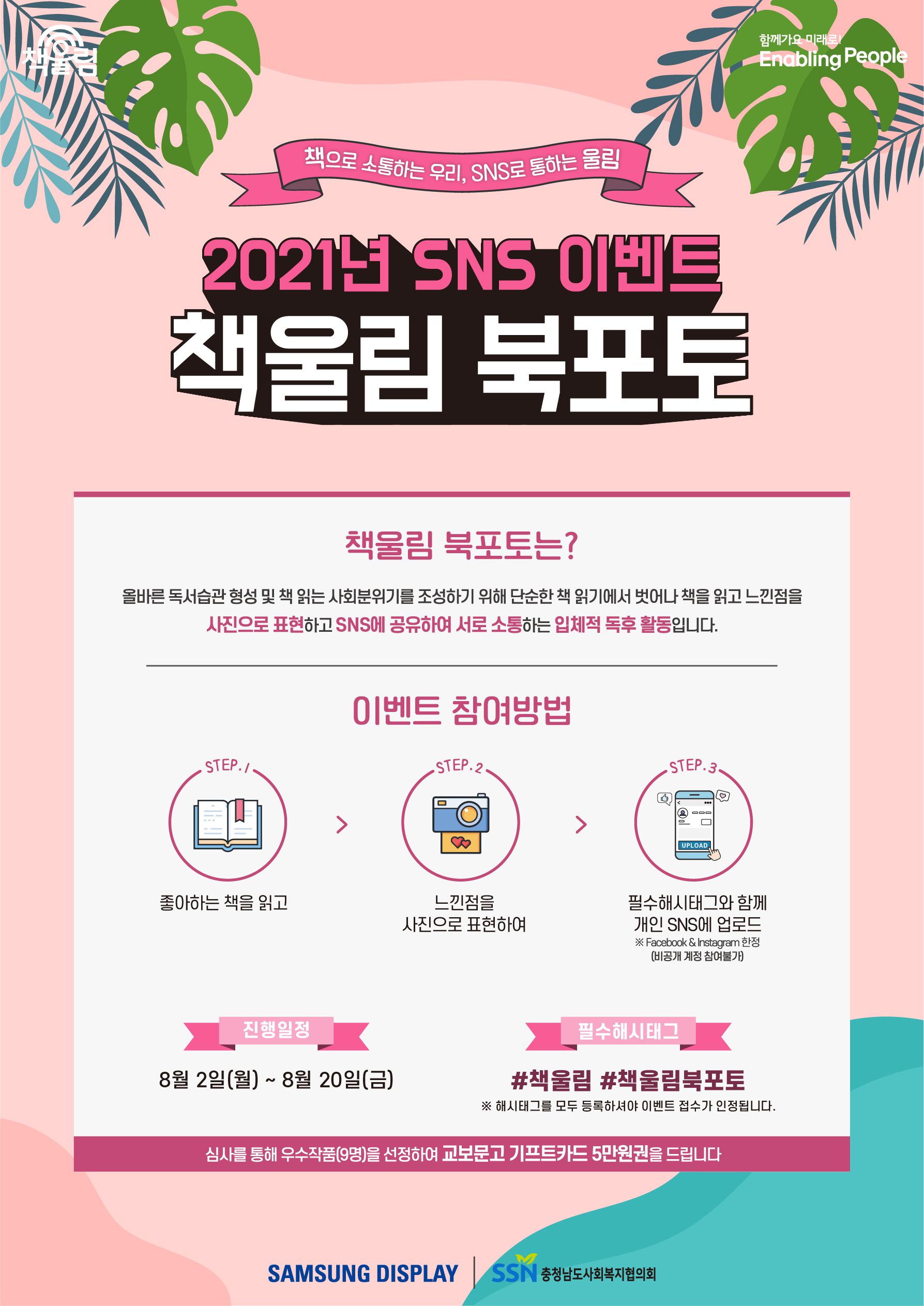 - 책을 읽고 느낀점을 '사진'으로 표현하고 '필수해시태그'를 포함하여 개인 SNS에 업로드