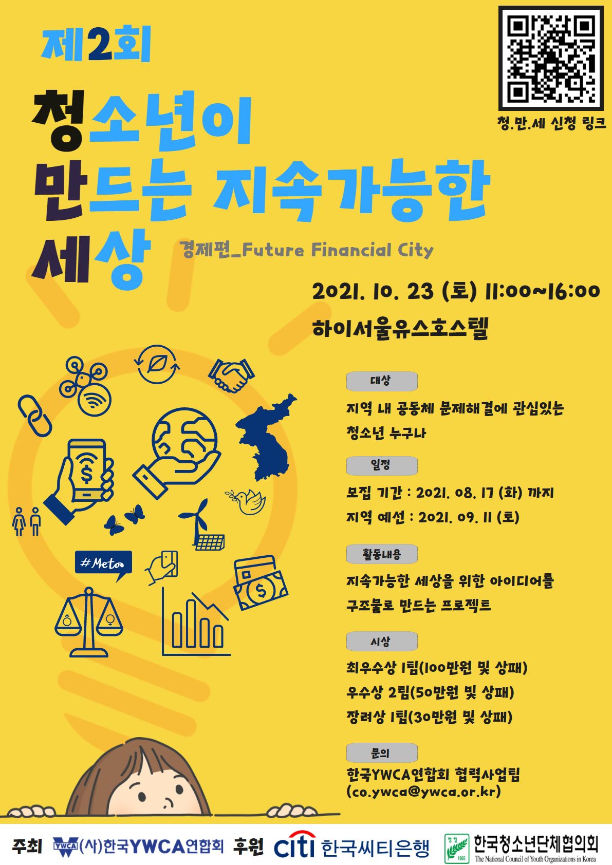 한국YWCA연합회는 청소년들이 자신이 속한 지역에서 스스로 이슈를 발굴하고, 해결 방법을 찾아보며 민주시민으로 성장할 수 있는 기회 마련을 위해 ‘제 2회 청소년이 만드는 지속가능한 세상_경제편(Future Financial City)(이하 청만세)’을 개최합니다. 아래 내용을 참고하시어 프로그램에 참여해주시기 바랍니다.