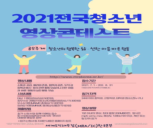 세계도덕재무장(MRA/IC)한국본부는 인성교육 활동을 통해 참된 청소년을 양성하는 청소년단체입니다. 2021년도 서울특별시교육청 지원사업으로 청소년들이 선한 마음과 바른 행동으로 함께 협력하고 공존하는 공동체의 행복한 삶을 살게 하여 성숙한 민주시민으로 성장토록 하는 본보기를 찾고자 하는 ‘2021 전국 청소년 영상 콘테스트’를 실시하고자 합니다.