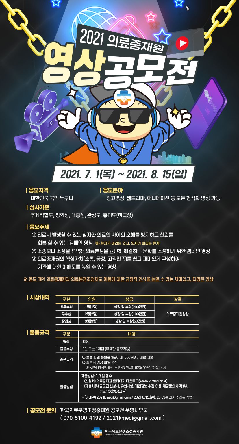 *세부주제 (택 1)* ① 진료시 발생할 수 잇는 환자와 의료인 사이의 오해를 방지하고 신뢰를 회복할 수 있는 캠페인 영상 ex. 환자가 바라는 의사, 의사가 바라는 환자 ② 소송보다 조정을 선택해 의료분쟁을 원만히 해경하는 문화를 조성하기 위한 캠페인 영상 ③ 의료중재원의 핵심가치(소통, 공정, 고객만족)를 쉽고 재미있게 구성하여 기관에 대한 이해도를 높일 수 있는 영상 |