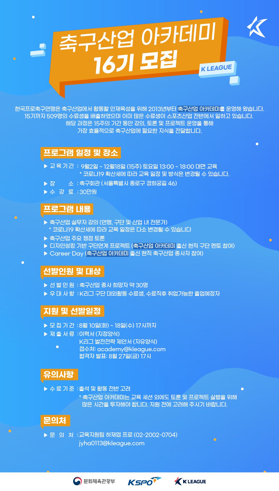 □ 문의: 교육지원팀 하재엽 프로 (jyha0113@kleague.com / 02-2002-0704)
