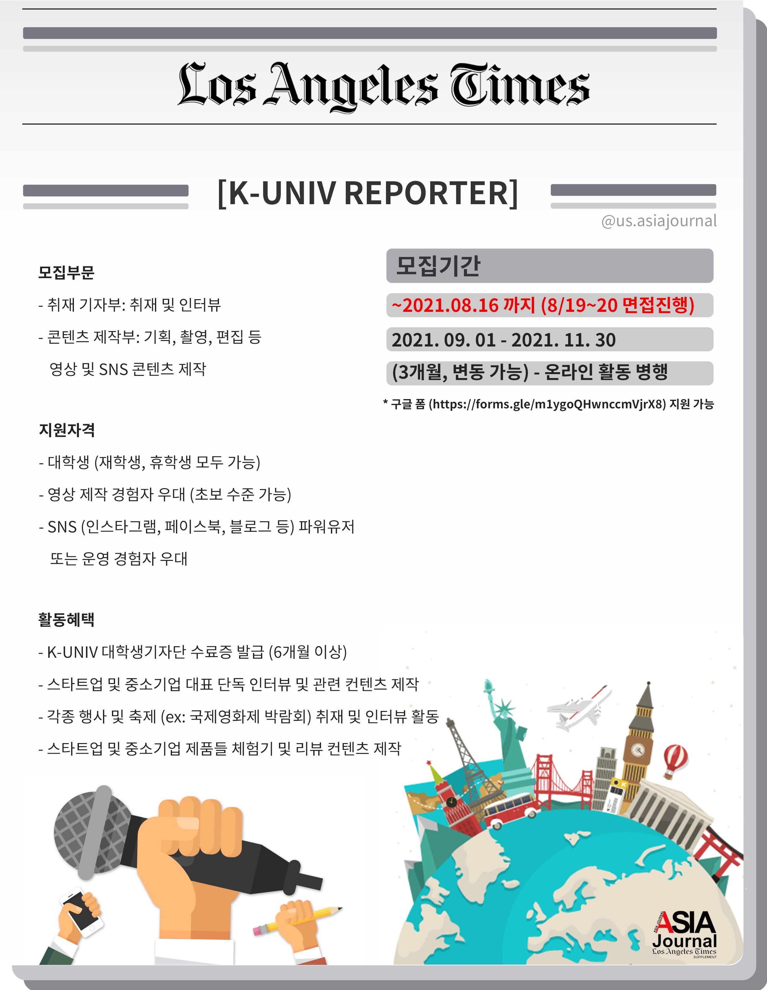 아시아저널을 담당하고 있는 엘에이타임즈 아시아지부에서 ' K-UNIV '를 모집합니다. 소셜미디어를 포함한 다양한 플랫폼을 활용하여 중소기업과 제품 관련 콘텐츠를 기획하고 제작하고자 합니다.