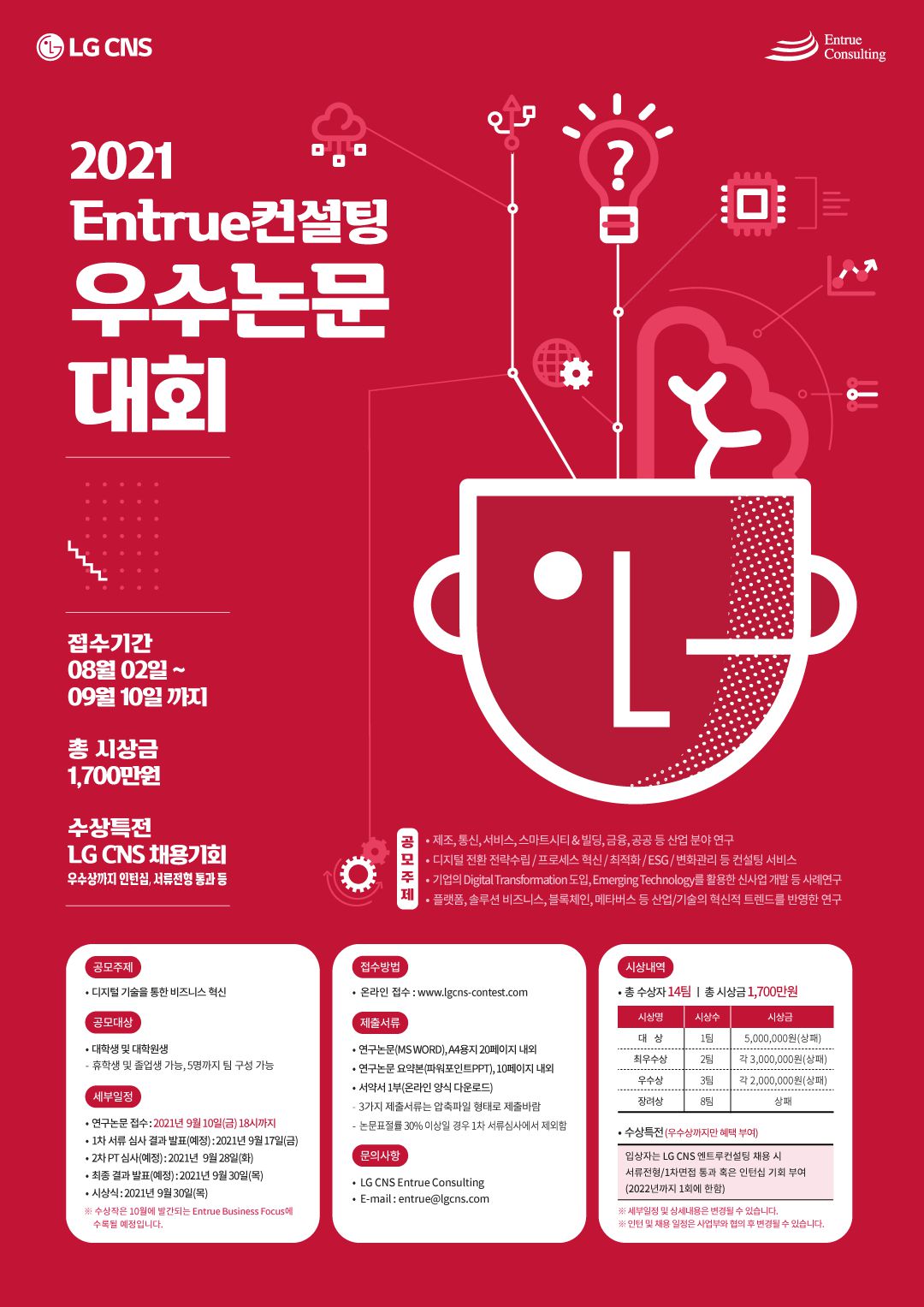 | 대상 | 1팀 | 상패 및 상금 5백만원 | 입상자는 LG CNS 엔트루컨설팅 채용시 서류전형/1차면접 통과 혹은 인턴십 기회 부여 (2022년까지 1회에 한함) |