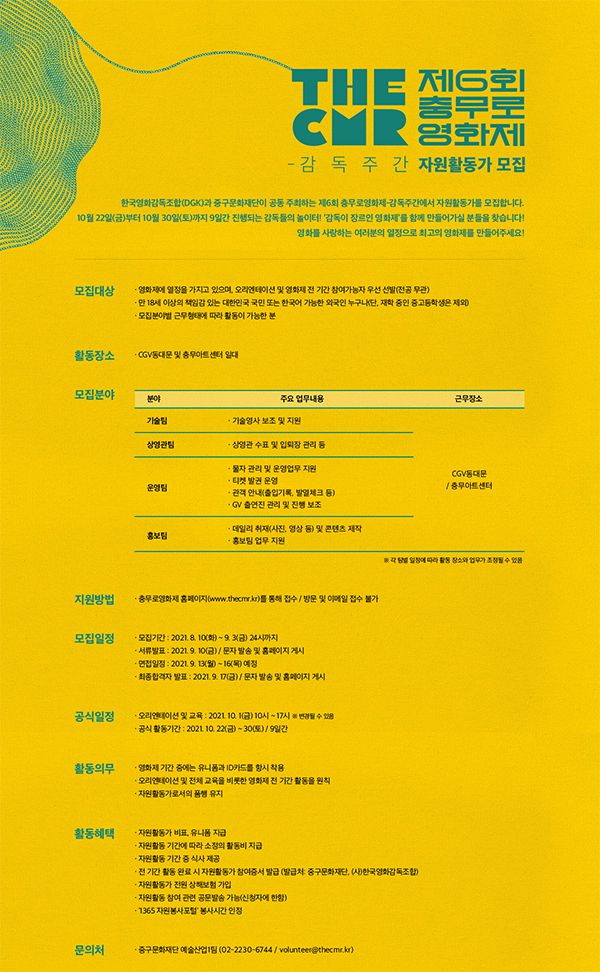 한국영화감독조합(DGK)과 중구문화재단이 공동 주최하는 제6회 충무로영화제-감독주간에서 자원활동가를 모집합니다. 10월 22일(금)부터 10월 30일(토)까지 9일간 진행되는 감독들의 놀이터! '감독이 장르인 영화제'를 함께 만들어가실 분들을 찾습니다! 영화를 사랑하는 여러분의 열정으로 최고의 영화제를 만들어주세요!