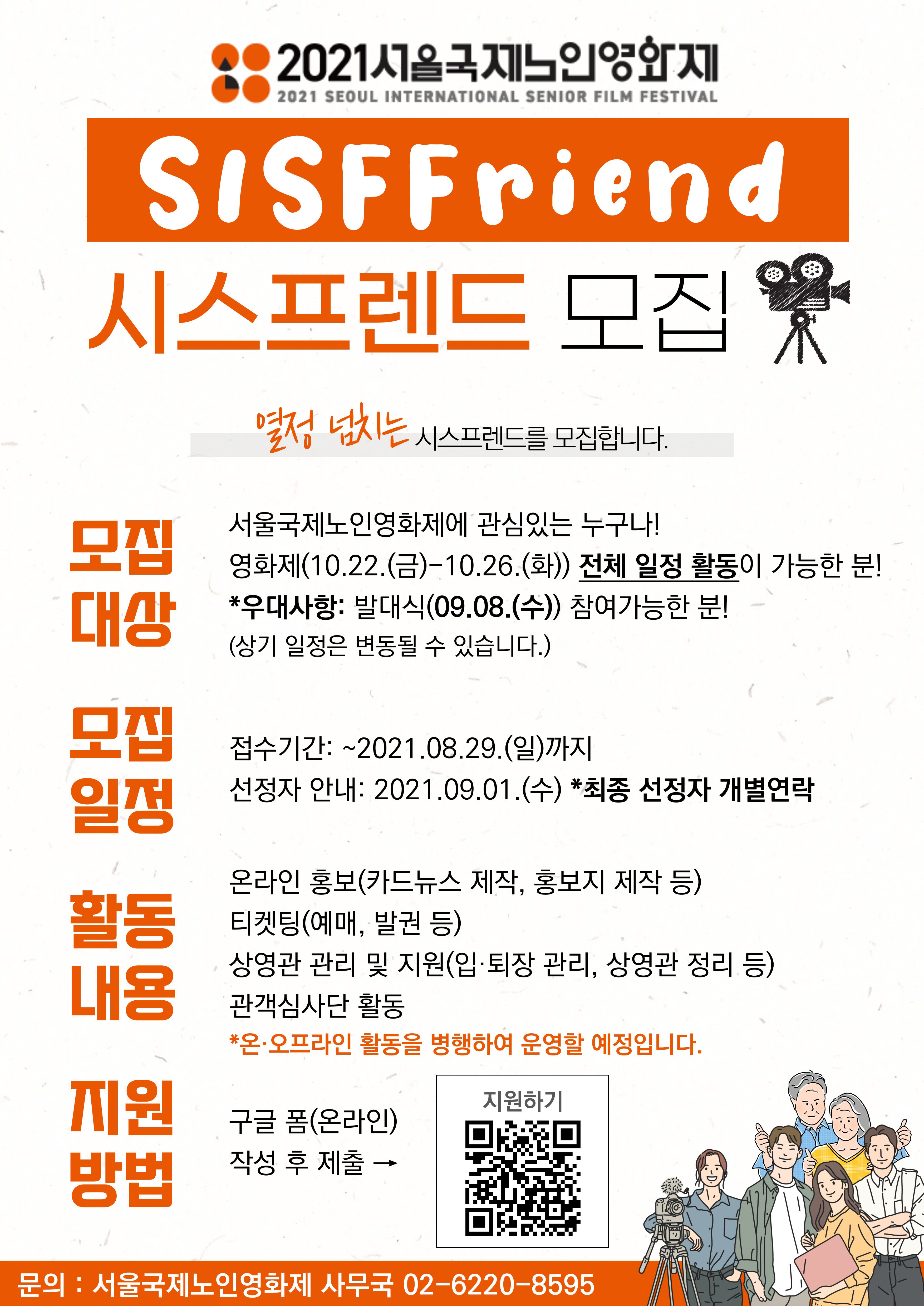 SISFF(서울국제노인영화제)와 Friend(친구)의 합성어로, 서울국제노인영화제를 함께 만들어가는 파트너를 말합니다. 청년과 노인 자원활동가가 함께 참여하는 SISFFriend(시스프렌드)를 운영하여 청년과 노인세대가 서울노인영화제의 스텝으로 활동하며 다른 세대와 연대하는 경험을 가질 수 있도록 합니다. 시스프렌드는 발대식, 시스프렌드상 시상을 위한 관객심사단 회의 등을 통해 서로의 생각을 교류하고 소통하는 기회를 가지며, 영화제 기간 중 다양한 분야에 스텝으로 활동하며 청년과 노인이 함께 협력하여 서울노인영화제를 만들어갈 예정입니다.