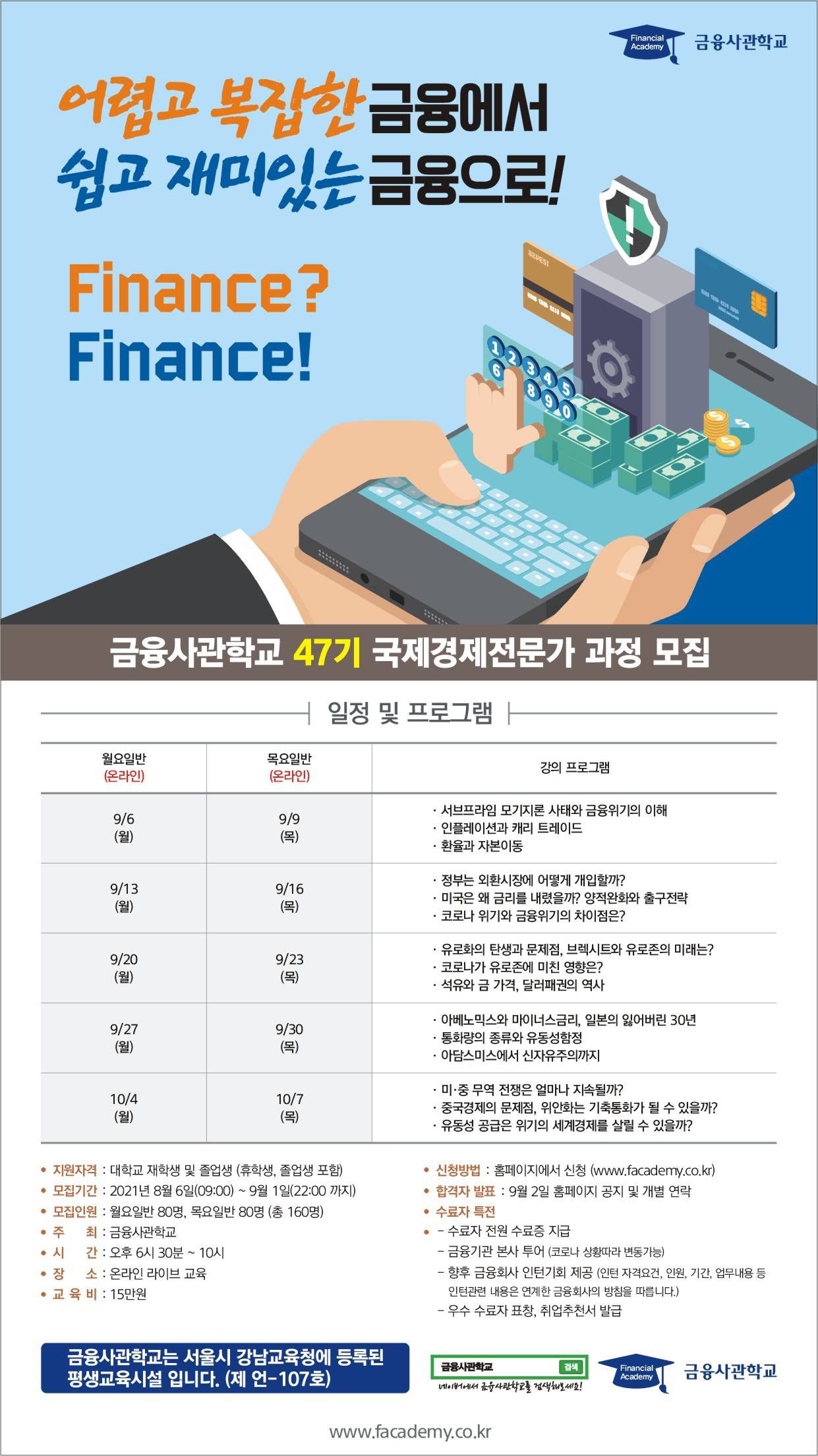많은 금융기관 현직자들이 참여한 금융사관학교가 국제경제전문가과정 47기를 모집합니다.