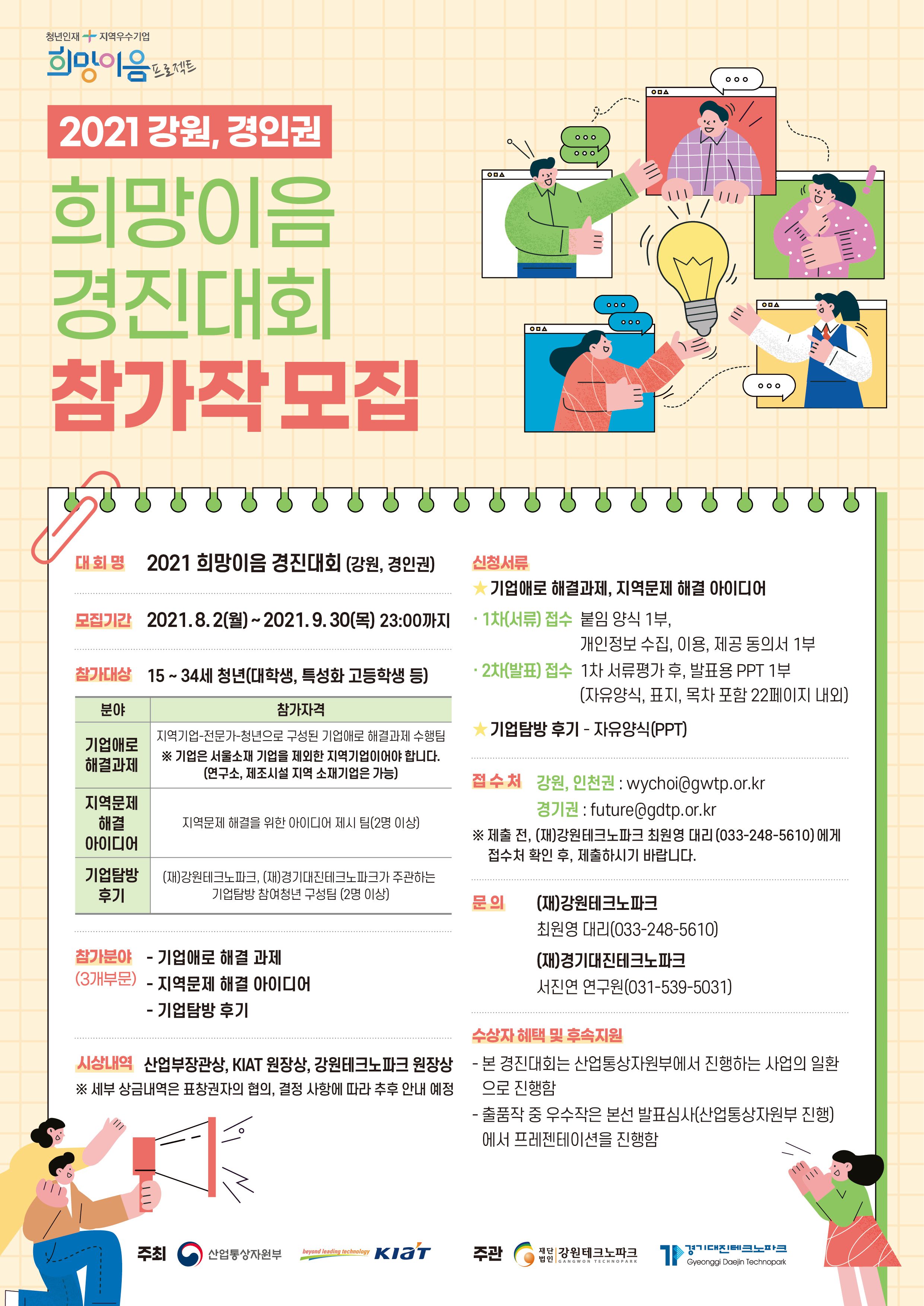 - 지역문제 해결 아이디어 : 강원, 경기, 인천 지역문제 해결을 위한 아이디어 제시 팀(2명이상)