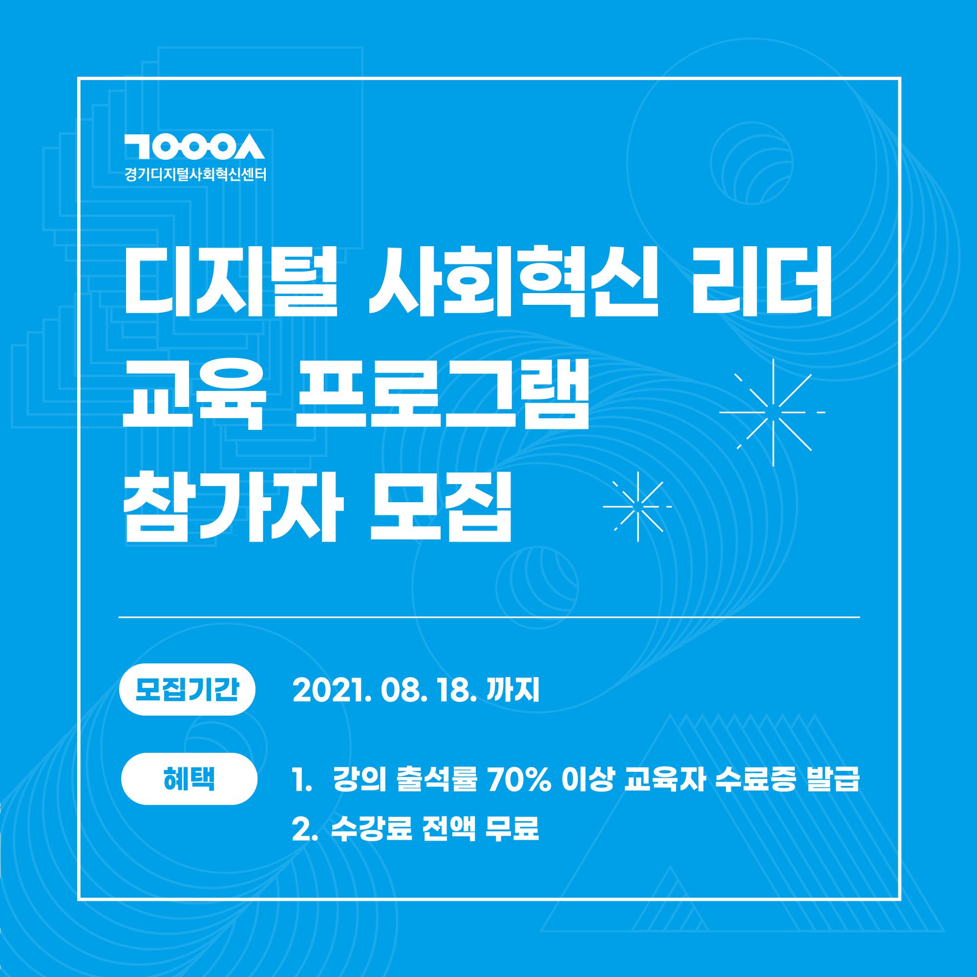 경기디지털사회혁신센터에서는 디지털 기술을 활용하여 시민중심으로 지역사회에 혁신을 일으키는 '디지털 사회혁신 리더'를 양성하기 위한 교육 프로그램을 운영합니다.