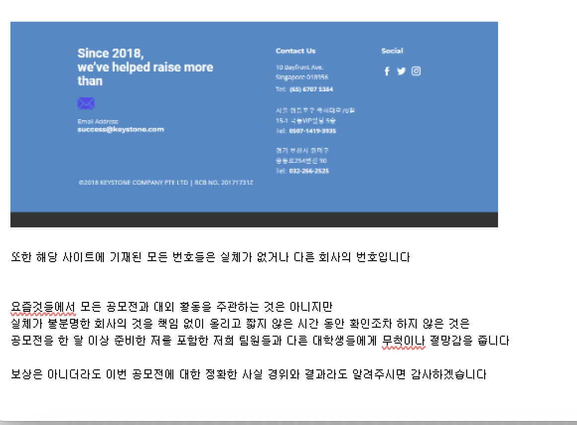 그러나 공모 기간 종료 후. 발표일이 지났는데도 아무런 소식이 없습니다. 연락처도, 메일도, 홈페이지도 감감무소식이자 이상함을 느낀 한 학생이 연락을 시도했지만 닿지 않았습니다. 잠깐 다시 살펴보니 홈페이지부터 연락처 모두 ‘가짜’인거 아니겠어요?