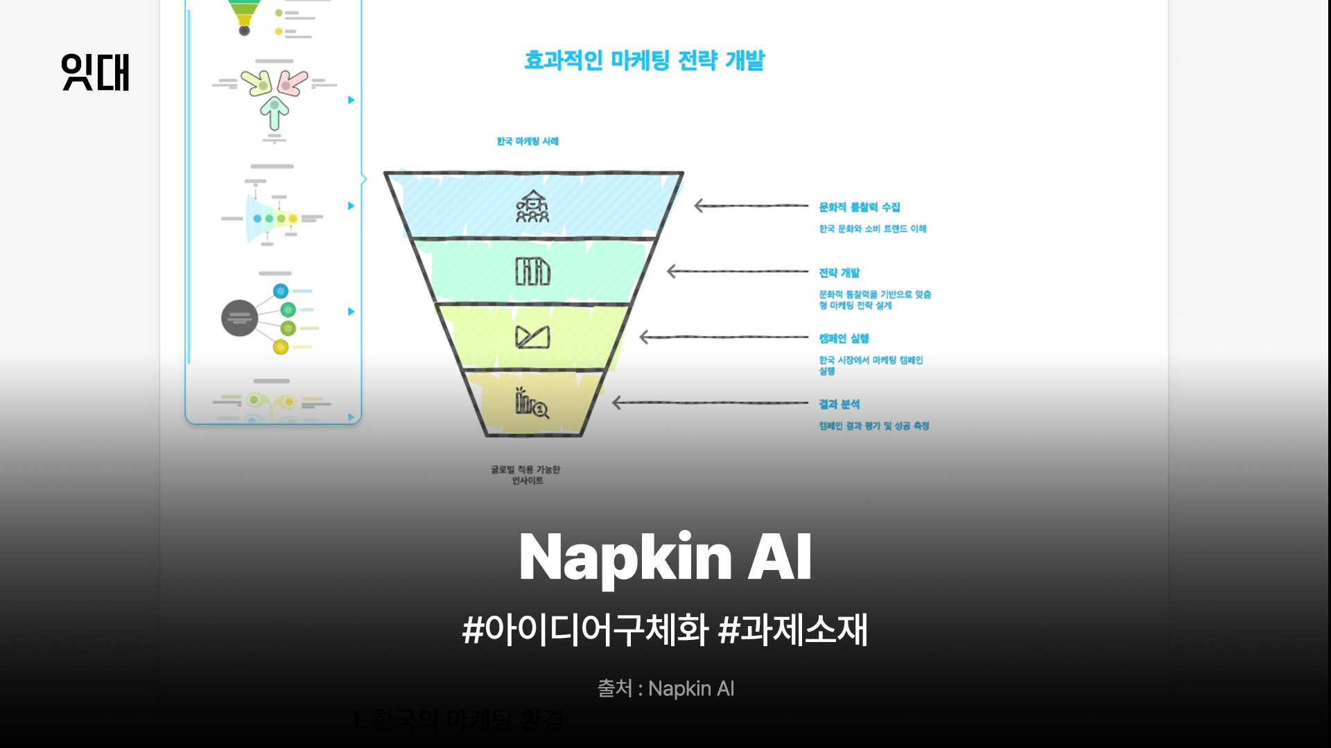 Napkin AI는 사용자가 입력한 키워드나 텍스트를 기반으로 아이디어를 생성하고 논리적 구조나 흐름을 정리해주는 도구입니다. 처음 과제나 프로젝트를 기획할 때 머릿속에서 정리가 되지 않을 때 큰 도움을 줍니다.