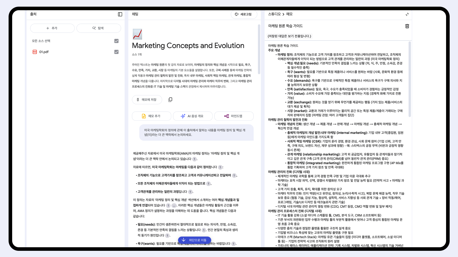 업로드한 파일의 내용을 분석하여 자동으로 중요 개념을 아래와 같이 정리해줍니다. 해당 페이지에서 자유롭게 내용을 수정하거나 개인적인 메모를 추가할 수 있어요. 또한 사용자가 질문을 입력하면 해당 문서를 바탕으로 정확한 답변을 제공합니다.