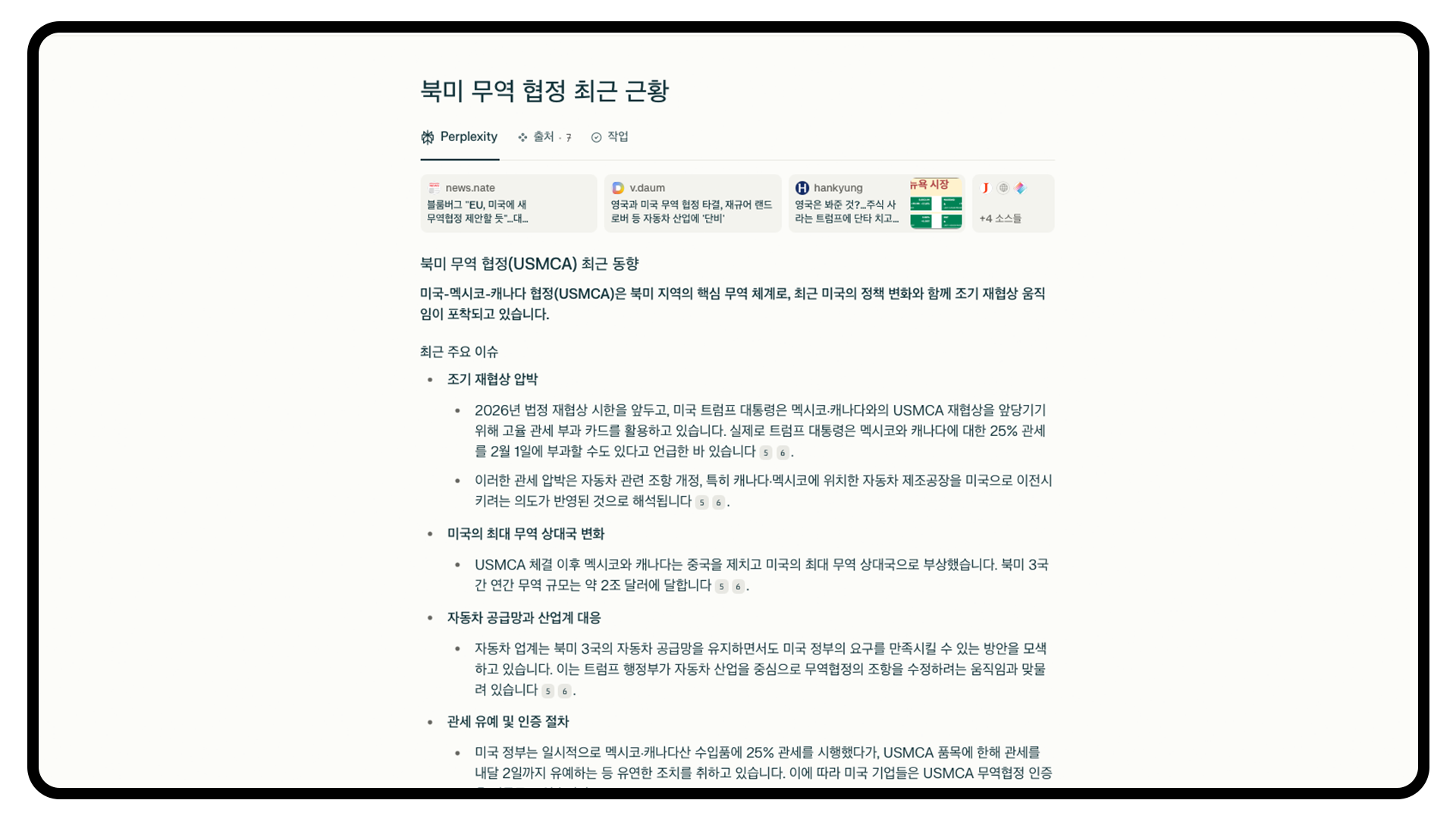 Perplexity는 ChatGPT 기반이지만 인터넷 실시간 정보를 제공하며, 각 답변마다 신뢰 가능한 출처(URL)를 함께 제시합니다. 검색을 하면 자동으로 참고한 자료의 출처를 상단에 링크로 남겨두어 좀 더 자세히 내용을 파악하고 싶을 때 유용합니다.
