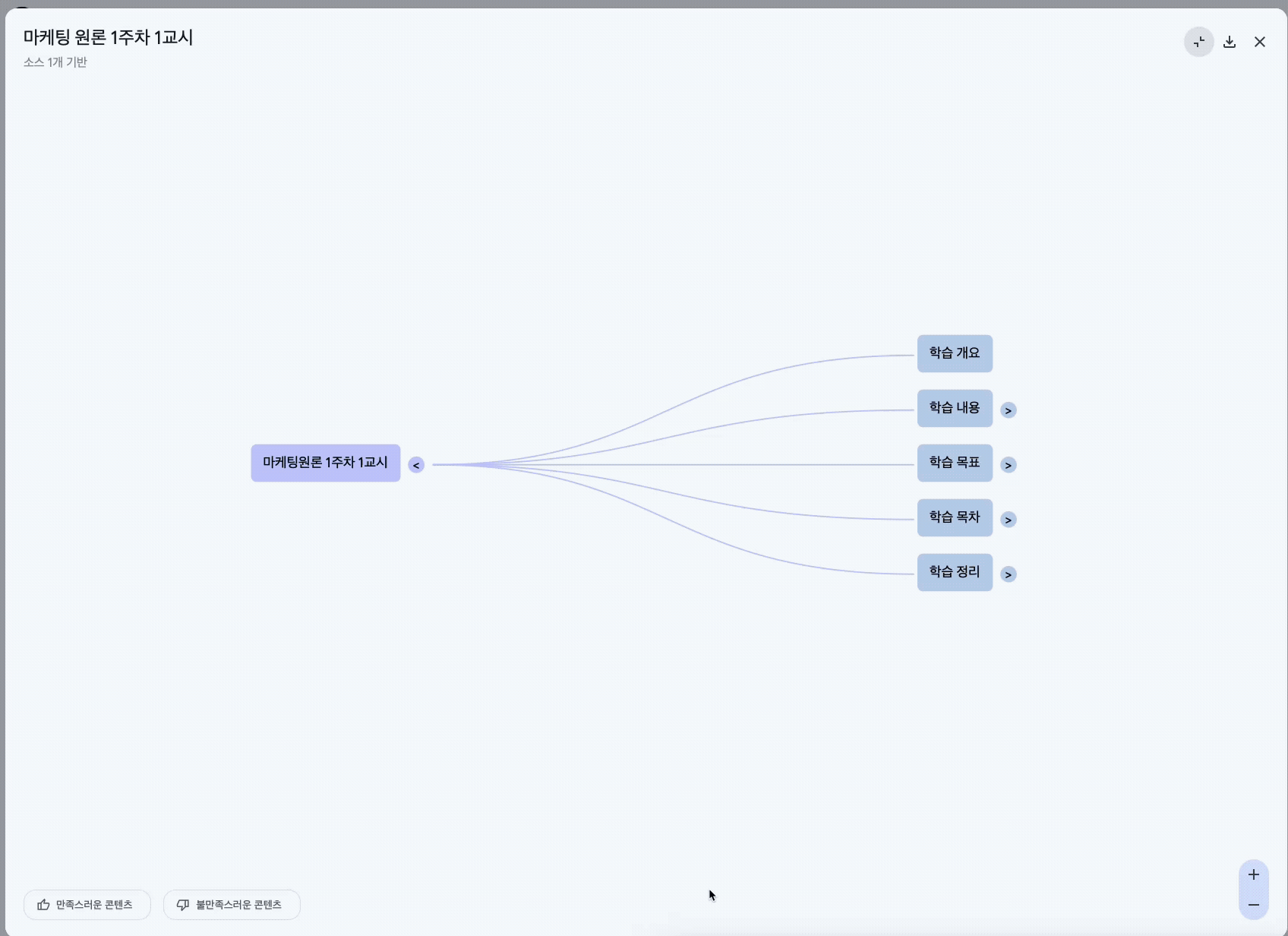 가장 인상깊은 점은 학습 가이드를 제공한다는 점인데요. 자동으로 업로드한 파일의 구조를 파악하여 '마인드맵' 구조를 만들어냅니다. 주요 개념과 하위 개념들을 보기 좋게 정리하여 배우고자 하는 핵심 주제를 한 눈에 담을 수 있습니다.