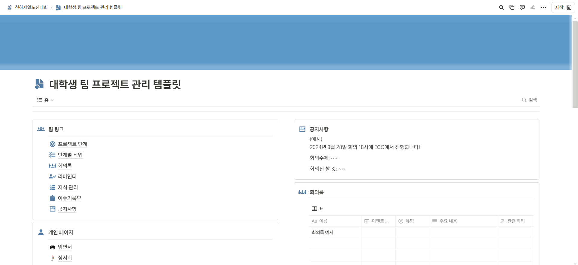 템플래닛에 있는 대학생 팀 프로젝트 관리 템플릿을 예시로 설명드리겠습니다.