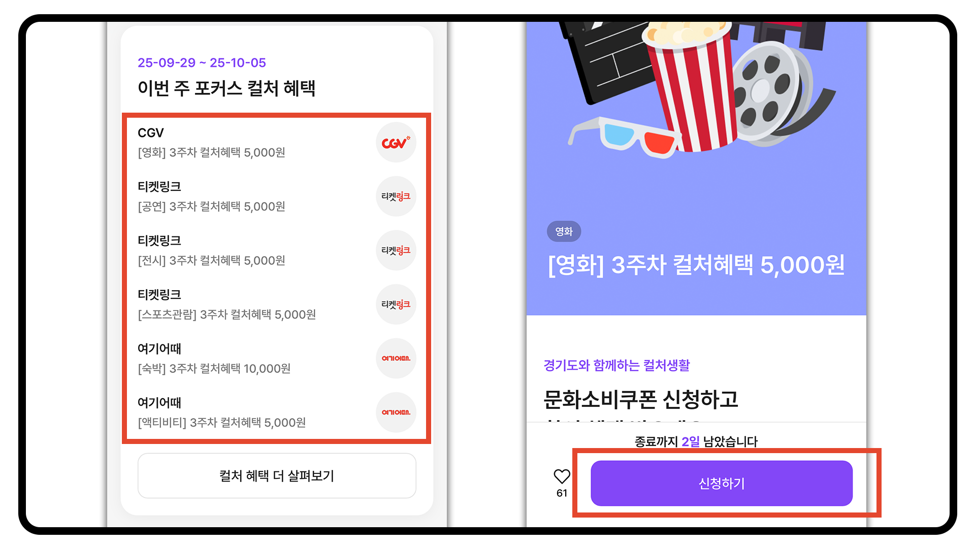 ✔️ 아래 이미지처럼, 매주 월요일 ~ 일요일까지 원하는 문화소비쿠폰을 신청하면