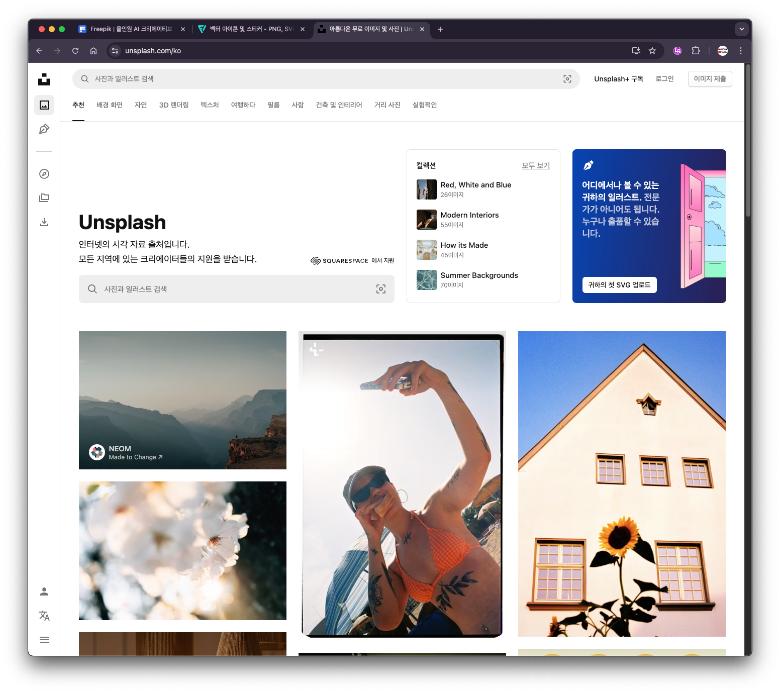 전 세계 사진작가들이 직접 제공하는 고해상도 이미지를 무료로 사용할 수 있는 플랫폼. 감성적인 이미지나 배경용 사진을 찾는다면 이곳이 정답입니다.