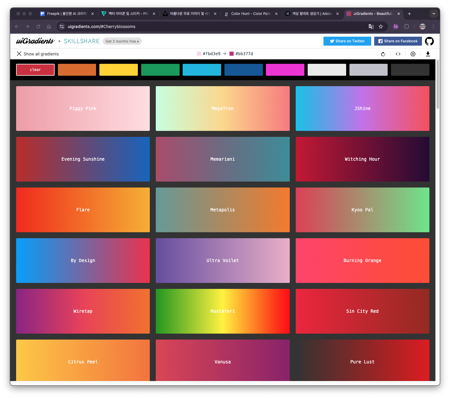 깔끔하고 세련된 그라디언트 배경 컬렉션을 제공하는 사이트. CSS 코드도 바로 복사 가능해 웹디자인 작업에 특히 유용합니다.