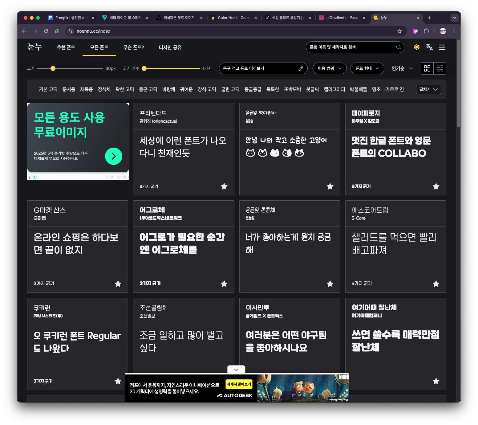 상업적으로도 자유롭게 쓸 수 있는 한글 웹폰트를 모아둔 사이트. 다양한 감성의 폰트를 미리보기와 함께 손쉽게 적용해볼 수 있어 국내 프로젝트에 꼭 필요합니다.