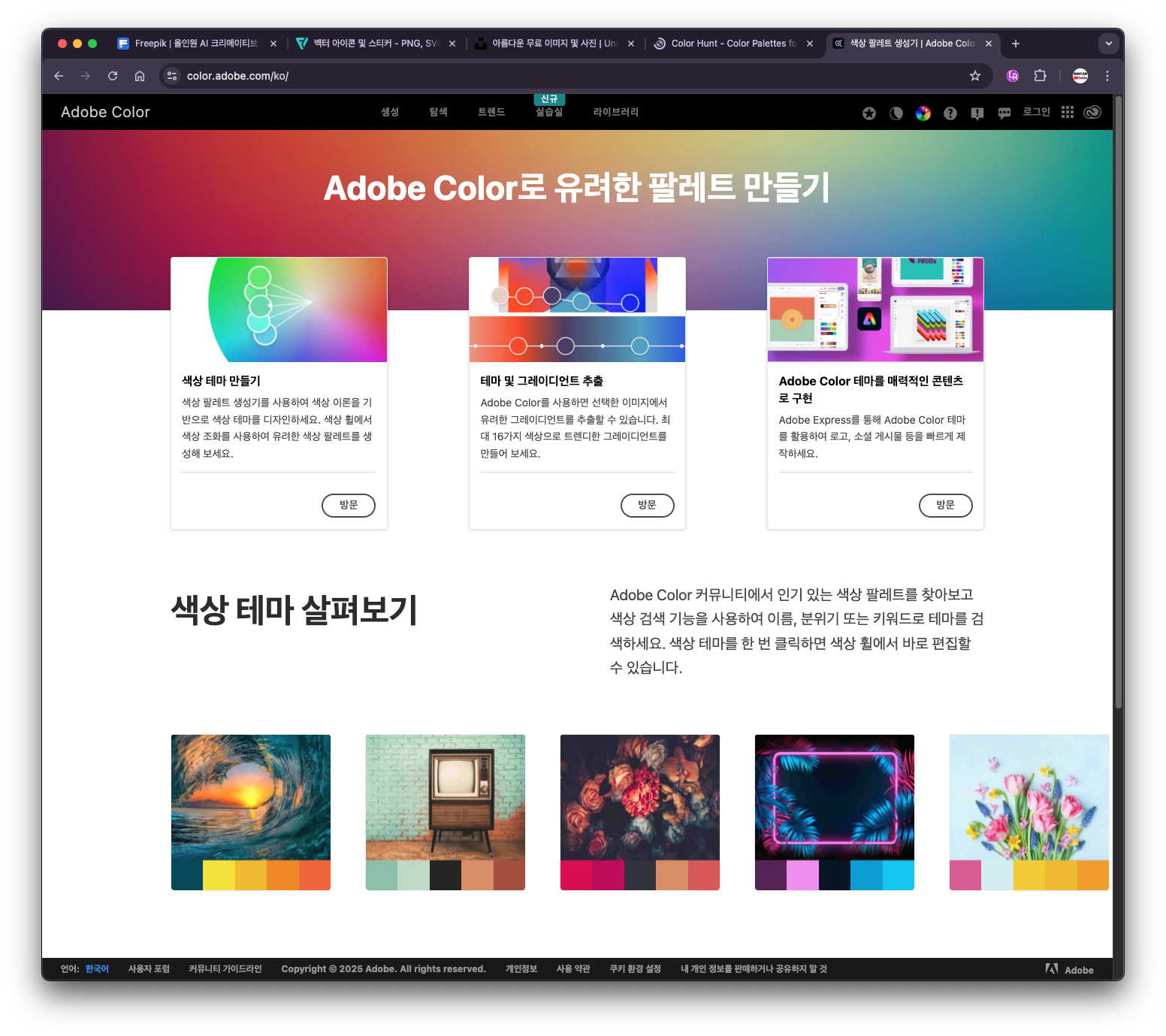 Adobe의 공식 컬러 툴로, 색상 조합을 만들고 조화 여부도 바로 확인할 수 있습니다. 사진에서 컬러 추출도 가능해 실무에서 자주 사용됩니다.