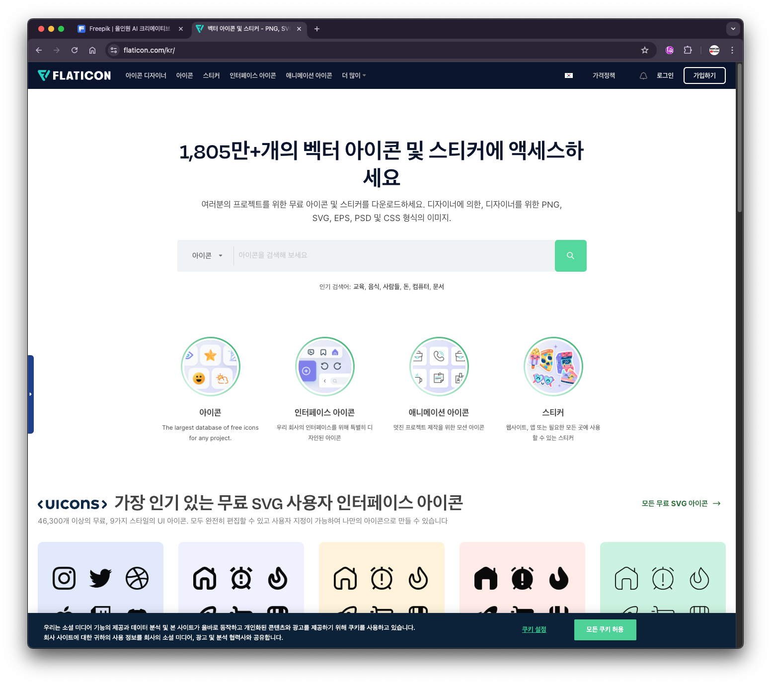심플한 라인 아이콘부터 컬러풀한 스타일까지. 원하는 테마의 아이콘을 빠르게 찾고 SVG, PNG 등 다양한 포맷으로 다운로드할 수 있어 웹/앱 디자인에 유용합니다.